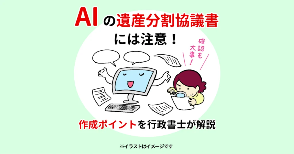 さらに、AIは文章をそれらしく整えて出力しますが、「代償分割」「換価分割」などの専門用語を正しく記載していない可能性があります。実際の金額や条件を誤記してしまうと、将来的にトラブルを生む可能性が高くなるため、AIに丸投げして遺産分割協議書を作成するのはリスクの高い行動なのです。